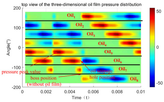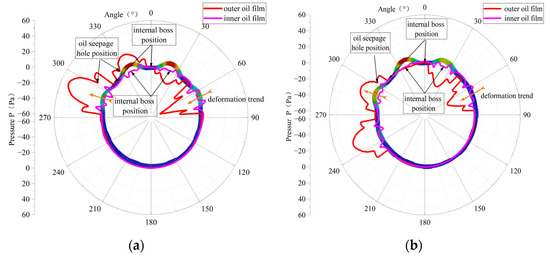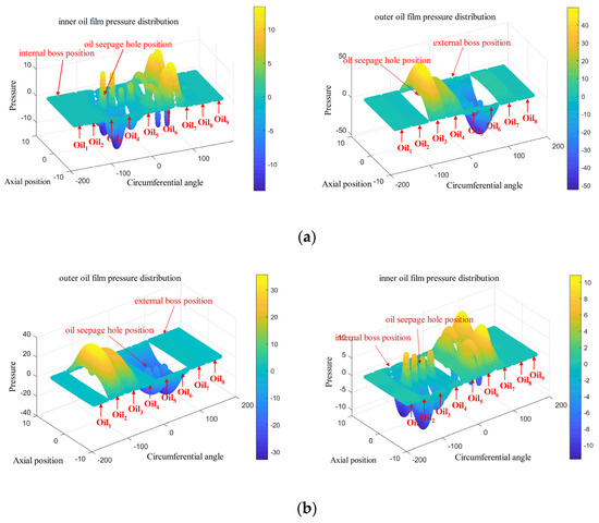 We can see from Figure 19 that at every moment, the outer oil film will have one oil chamber with the maximum pressure, such as in Figure 19a and in Figure 19b. And the pressure peak of the inner oil film will appear in the adjacent two oil cavities, such as and in Figure 19a,b, which indicates that the circumferential distribution pressure of the outer oil film always appears in the center of the oil cavity, while the maximum pressure position of the inner oil film appears in the adjacent area of the two oil cavities, that is, around the inner camber.