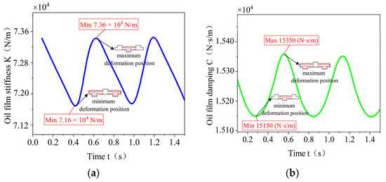 Oil film stiffness and damping. (a) Time-varying oil film stiffness curves. (b) Time-varying oil film damping curve.
