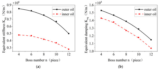 Effect of the number of bosses on the oil film stiffness and damping inside and outside. (a) Changes in equivalent stiffness. (b) Time-varying oil film damping curve.