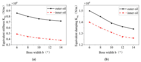 Effect of boss width on the oil film stiffness and damping inside and outside. (a) Change in equivalent stiffness. (b) Variation in equivalent damping.
