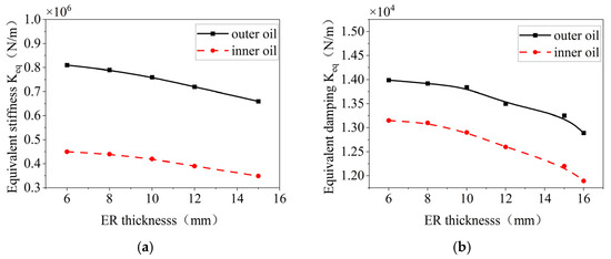 The effects of the thickness of the elastic ring on the stiffness and damping of the inner and outer oil films are shown in Figure 25, where a decrease in the equivalent stiffness and damping of the oil film occurs as the thickness increases.