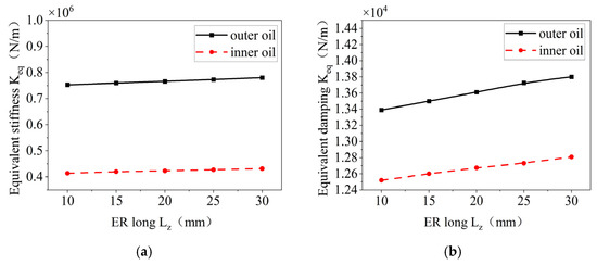 Effect of elastic ring length on stiffness and damping of inner and outer oil films. (a) Change in equivalent stiffness. (b) Change in damping.