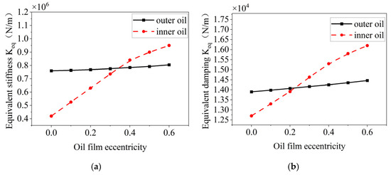 The effect of the oil film eccentricity on the stiffness and damping of the inner and outer oil films is shown in Figure 27, which shows that as the eccentricity of the oil film increases, the equivalent stiffness and damping of the inner and outer oil films are increased to some extent. The change in the equivalent stiffness and damping of the inner oil film is more obvious, which is due to the fact that the change in the eccentricity of the oil film will directly lead to a change in the oil film thickness of the inner oil film.