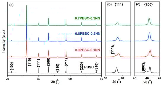 (a) XRD patterns of PBSC–NN compositions and the enlargements of (b) (111) and (c) (200) peaks.