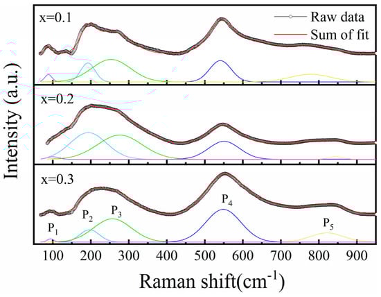 Raman spectra of (1-x)PBSC–xNN (x = 0.1, 0.2, and 0.3) and fitted peaks (P1~P5).