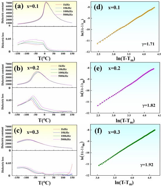 (a–c) Dielectric constant and loss of (1-x)PBSC–xNN and (d–f) the corresponding diffusivity of the dielectric constant as fitted by the modified Curie–Weiss law.