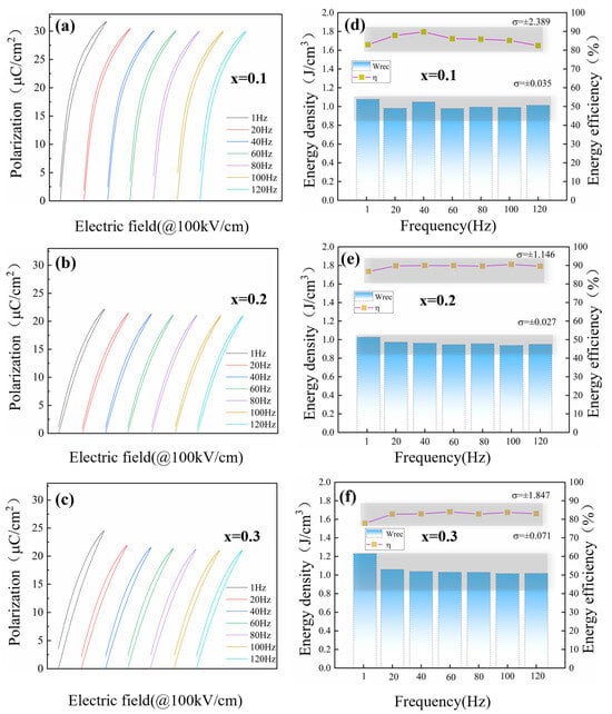 (a–c) Frequency-dependent unipolar P-E loops and (d–f) the variation in recoverable energy density (Wrec) and efficiency (η) of (1-x)PBSC–xNN ceramics from 1 to 120 Hz.