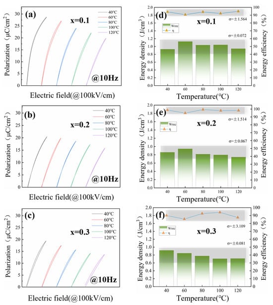 Figure 6 and Figure 7 show the frequency- and temperature-dependent unipolar P-E loops and energy storage properties of PBSC-NN. The variation in Wrec and can be characterized by the standard deviation (σ) of these values measured from samples in elevating temperatures and frequencies. It is noted that the shape of ferroelectric loops remains slim with elevating temperature, even above the Tm temperature, confirming the stable relaxor ferroelectricity of the material. Furthermore, in both tested frequency (1~120 Hz) and temperature ranges (40~120 °C, 10 Hz), the high entropy composition 0.8PBSC–0.2NN demonstrates the most stable performance, as evidenced by the smallest fluctuation of Wrec and (Figure 6e and Figure 7e). This could be contributed by the entropy-stabilized phase structures and PNRs, which make the material a promising candidate for practical applications of electrostatic capacitors.