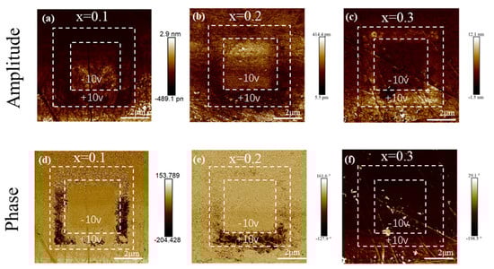 Out-of-plane PFM (a–c) amplitude and (d–f) phase images of (1-x)PBSC–xNN ceramics measured under the poling field of ±10 V.