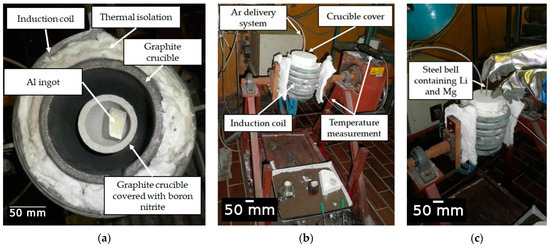The Al-2.18Mg-1.92Li alloy was synthesized in an induction melting furnace using a protective argon (Ar) atmosphere and a complete crucible cover (Figure 2). The technically pure Al ingot (99.8%) was mechanically cleaned using a wire brush and placed in a graphite crucible. The protective atmosphere was generated using compressed Ar with the designation UN 1006 and a pressure of 10.0 MPa. Before they were placed into a steel bell, a Mg rod (99.98% purity) and a Li rod (99.8% purity) were wrapped in commercially pure Al foil (Figure 2b). The graphite crucible and the steel bell were coated in born nitrite to prevent crucible attack and contamination of the melt. The aluminum ingot melted at a temperature of about 690.0 °C. The Mg and Li were added at 720.0 °C by immersing the steel bell (Figure 2c). To offset the reduction in temperature resulting from the addition of alloying elements, the melt was heated to 720.0 °C. A steel rod was used to collect the small number of oxides that had floated to the surface of the melt. The sample was then cast in the open atmosphere and solidified in a permanent steel mold.