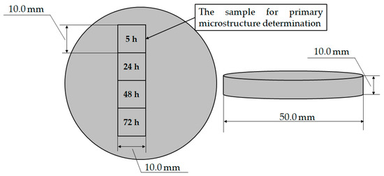 The four samples for degradation testing were obtained by cutting the sample with a circular geometry and diameter of Ø 50.0 mm and thickness of 10.0 mm (Figure 3).
