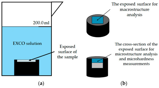 Before exposure, the samples were mounted in a conductive material at 180.0 °C and 250.0 bar using mounting equipment CitoPress-30, Struers, Copenhagen, Denmark. Mounting was performed to limit the degradation effect of the EXCO solution to only one exposed surface (Figure 4a). The mounted samples were automatically prepared using standard metallographic preparation techniques with grinding and polishing machine Tegramin-30, Struers, Copenhagen, Denmark. The parameters used to evaluate the degradation susceptibility of the samples under severe degradation conditions are listed in Table 1.