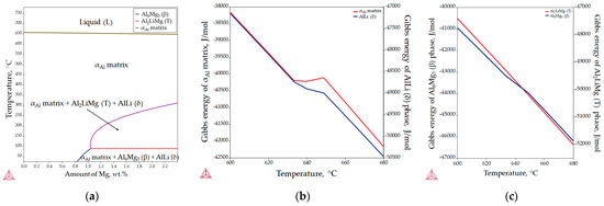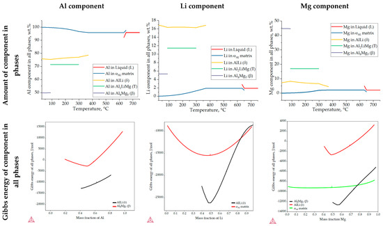 Figure 6 shows the results of the one axis equilibrium calculation of the component distribution in all the phases and the calculation of the Gibbs energy as a function of the mass fraction of the components at a temperature of 25.0 °C. The consideration of the component distribution in the liquid (L) phase stopped with the development of the αAl dendritic network, confirming that it is the only solidifying phase in the Al-2.18Mg-1.92Li alloy system (Figure 6). The precipitation of intermetallic phases leads to a decrease in the content of Mg and Li in the αAl matrix (Figure 6). The Al2LiMg (T) phase retains the same chemical composition of 71.5 wt.% Al, 11.4 wt.% Li and 17.1 wt.% Mg until the temperature reaches 89.1 °C when it stops precipitating (Figure 6). A similar behavior is exhibited by the Al8Mg5 (β) phase, which maintains a chemical composition of 27.8 wt.% Al, 44.7 wt.% Mg and 5.4 wt.% Li from 89.1 °C (Table 3) to the end of the solidification sequence (Figure 6). The influence of Mg on reducing the solid solubility of Li in the αAl matrix as well as its tendency to substitute Li atoms in the binary Al-Li phase lattice can be observed at the end of the solidification sequence, when the precipitation of the Al8Mg5 (β) phase leads to an increase in the Li content in the AlLi (δ) phase from 16.3 wt.% to 17.0 wt.%, while the Mg content decreases from 8.3 wt.% to 7.2 wt.% (Figure 6). This redistribution of components can explain the deviation in the Gibbs energy of the Al8Mg5 (β) phase in the temperature range of 633.0 to 648.0 °C (Figure 5c). The one axis equilibrium calculation showed no bulking of the αAl matrix with Li or Mg at the end of solidification (Figure 6).