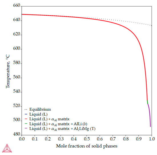 Unlike previous thermodynamic calculations, classical Scheil calculations stop with the complete solidification of the liquid (L) phase. In classic Scheil calculations, the chemical composition of the individual volume elements of the solid phase remains the same throughout the solidification process. Apart from the Al8Mg5 (β) phase, the non-equilibrium calculations assume the development of the same intermetallic phases (Figure 7, Table 4) as the equilibrium calculations but at higher temperatures (Figure 5). The non-equilibrium solidification sequence begins with the development of the primary αAl dendritic network at 648.7 °C and the solidification of the AlLi (δ) phase at 548.7 °C and ends with the solidification of the Al2LiMg (T) phase at 524.0 °C (Table 4). In addition, the Al-2.18-1.92Li alloy exhibits a wide solidification range with a larger temperature gradient and degree of undercooling (Figure 7, equilibrium solidification line). The solidification under these circumstances enables microstructure refinement and improvements in alloy properties and microstructure degradation resistance.