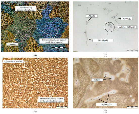 At a high Li/Mg ratio (Equation (1)), the microstructure development begins with the eutectic solidification of the αAl matrix and the Al3Li (δ’) phase. The solidification of the stable AlLi (δ) phase at the αAl grain boundaries occurs during the peritectic reaction with the participation of the previously solidified metastable Al3Li (δ’) phase and the bulk liquid (L) [33]. On the other hand, the peritectic reaction in the AA with a low Li/Mg ratio (Equation (2)), leads to solidification of the ternary Al2LiMg (T) phase at the high-angle grain boundaries. In both cases, the involvement of the Al3Li (δ’) phase in the peritectic reaction and the development of other microstructure constituents leads to the formation of precipitate-free zones (PFZs) near the αAl grain boundaries (Figure 1a). The amount of grain boundary precipitates is also increased by the Al8Mg5 (β) and Al12Mg17 (γ) phase solidification. The peritectic reaction involving the Al2LiMg (T) phase and the Mg bulked liquid (L) results in the solidification of the Al12Mg17 (γ) phase, which hinders the αAl grain boundary mobility and reduces the grain size [32]. The microstructure development ends with the solidification of the brittle and irregular Al8Mg5 (β) phases and the Mg bulked αAl matrix due to bulking of the liquid phase (L) with Mg (Figure 1a) [34].