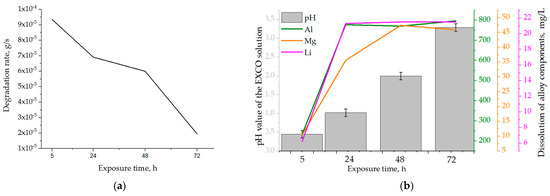 Although the pH of the EXCO solution remained acidic throughout the test period, it increased with increasing exposure time (Table 6) due to ion exchange between the exposed surface of the samples and the environment. Based on the literature [38], pH values outside the range of 3 to 10 will lead to cavity formation on the exposed surface, allowing further microstructure degradation. From the dependence of the degradation rate on the exposure time shown in Figure 9a, it can be concluded that the degradation rate decreased with the increase in exposure time. The obtained results are in agreement with the data available in the literature [43], identifying the pH of 0.4 as critical for Al-Li and Al-Li-X (where X is an additional alloying element) alloys.