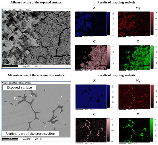 The microstructure of the exposed surface shown in Figure 10 reveals a uniform degradation within the αAl grains and along the grain boundaries. The results of the scanning electron microscopy of the exposed surface confirmed uniform dissolution of the αAl matrix with the local appearance of dimples caused by the dislodgement of the intermetallic phases (Figure 11, microstructure of the samples’ surface). The appearance of a stronger localized degradation in the form of cavities was noticeable after 72 h of degradation (Figure 11). The mapping analysis at higher magnification revealed that the decomposition products of the surface consisted of chlorine and oxygen, with an approximate chemical composition of 54.0 wt.% Al, 36.3 wt.% O, 7.8 wt.% Cl and 1.5 wt.% Mg (Figure 12, microstructure of the surface).