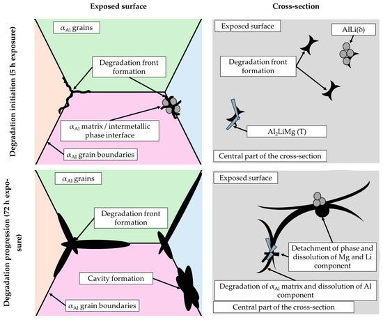 By considering the influence of degradation time on the physical properties of the samples, an increase in mass loss with increasing degradation time was observed. The increase in the pH value of the solution from an initial 0.4 to 3.3 was also observed. The highest degradation rate of 9.3 10−5 g/s was calculated for a degradation time of 5 h. A further increase in the exposure time resulted in a decrease in the degradation rate. These results are in accordance with the data available in the literature indicating that Al-Li alloys are most sensitive to a pH of 0.4 [38]. The results of the ICP-MS analysis of the solutions after degradation indicated the occurrence of dealloying and dissolution of all three components. Aluminum experiencing the highest dissolution of all the components indicates that the microstructure degradation and dealloying most likely occur through the dissolution of the αAl matrix, while the increase in the other two components may be a consequence of intermetallic phase detachment or dissolution of the bulked αAl matrix. Considering the conclusions of previously used methods, the first mechanism is the most likely [42]. A schematic representation of the degradation mechanism of the Al-2.18Mg-1.92Li alloy is shown in Figure 13. This was confirmed by the results of the light microscopy and scanning electron microscopy performed on the exposed surface as well as on the cross-section of the samples after exposure. The microstructure of the exposed surface revealed uniform degradation within the αAl grains and along the grain boundaries without visible cavity formation (Figure 13, microstructure of the exposed surface). The results of the scanning electron microscopy of the exposed surface confirmed uniform dissolution of the αAl matrix with the local appearance of dimples caused by the detachment of the intermetallic phases (Figure 11 microstructure of the exposed surface). The appearance of a stronger localized degradation in the form of cavities was noticeable after 72 h of degradation (Figure 11, microstructure of the exposed surface, 72 h exposure). Although the formation of the cavities was expected much earlier, this observation is not consistent with the data available in the literature that indicates the formation of cavities outside the pH range of 3 to 10 [38]. The microstructural analysis of the cross-section surface showed that the degradation started at the interface between the αAl matrix and the intermetallic phases (Figure 13, microstructure of the cross-section, degradation initiation). Extending the exposure time led to the degradation progression along the interface and the formation of cavities (Figure 13, microstructure of the cross-section, degradation progression). Since the intermetallic phases were preserved ahead of the degradation front, it can be assumed that the microstructural degradation was caused by an anodic mechanism, followed by a detachment of the intermetallic phases due to the instability of the degradation products (Figure 13, microstructure of the cross-section, degradation progression). The values of the standard deviation for the microhardness measured after 5, 48 and 72 h of exposure time showed and confirmed the local instability of the αAl matrix near the degradation products, while the increase in the microhardness value of the samples after degradation indicated an increase in stress and the wedging effect of the degradation products. The metallographic analysis of the samples after the electrochemical corrosion test and the Tafel extrapolation method showed that the degradation started with the formation of cavities on the surface of the sample and progressed intergranularly, involving both intermetallic phases and the αAl matrix [44]. Compared to previously performed electrochemical tests, the results obtained by immersing the samples in the EXCO solution allowed for the identification of the degradation mechanism as an anodic. Microstructure analysis revealed that the intergranular degradation started at the interface between the αAl matrix and the intermetallic AlLi (δ), Al2LiMg (T) and Al8Mg5 (β) phases. The degradation progression and the detachment of the intermetallic phases are the result of a local instability induced by the wedge effect of the degradation products.