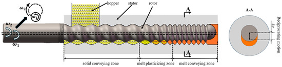 The eccentric rotor extruder (ERE) is polymer processing equipment that offers advantages such as low energy consumption, short thermal-mechanical history, high adaptability to materials, and good dispersion and mixing performance [1]. It has demonstrated good performance in processing composite material systems such as a polymer filler system [2,3], polymer blend systems [4,5], and high-performance polymers like ultra-high molecular weight polyethylene [6,7,8], which are difficult to process.