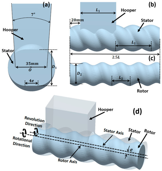 ERE solid conveying section geometry model: (a) stator and hopper cross-sectional dimensions, (b) stator and hopper axial dimensions, (c) rotor dimensions, (d) model perspective view.
