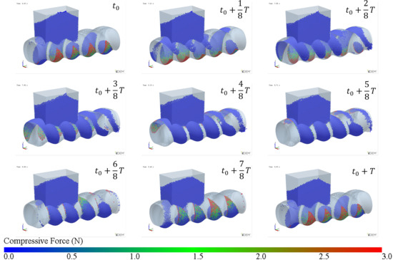 - Wang, S.; Li, H.; Tian, R.; Wang, R.; Wang, X.; Sun, Q.; Fan, J. Numerical simulation of particle flow behavior in a screw conveyor using the discrete element method. Particuology 2019, 43, 137–148. [Google Scholar] [CrossRef]