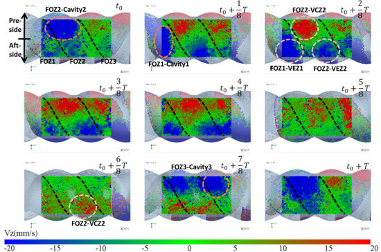 In Figure 7 (t0 + 2/8T to t0 + 5/8T), particles flow into the cavities through the aft-side feed openings. The feeding rate varies with the expansion of the VEZ in the aft-side cavity. Since the VEZs of Cavity1, 2, and 3 expand at the same rate on the aft-side, the feeding rates of Cavity1 and 2 (as t0 + 2/8T: FOZ1–VEZ1 and FOZ2–VEZ2) are comparable. However, the feeding rate of Cavity 3 is relatively lower for the same reason as the reduced feeding rate observed in the aft-side cavity feeding process mentioned above.