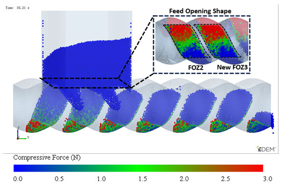 The variation in velocity is shown in Figure 7 and Figure 8 (see Video S2). Particles only flow into the cavities when they move near the feed opening, and the feed opening becomes a gap in the enclosed cavities. Since the cavities spiral forward along a fixed trajectory, and the position of the feed opening, which can become its gap, is also fixed (feed opening zone, FOZ). As shown in Figure 7, the black dashed lines divide the feed opening regions (Figure 7 (t0): FOZ1, FOZ2, and FOZ3) corresponding to the three cavities (Figure 5: Cavity1, Cavity2, and Cavity3). Because cavities rotate in a clockwise direction along the axial direction, they will sequentially connect with the feed opening from both the upper and lower sides (pre-side and aft-side). And the process of feeding from the upper and lower sides differs. The simulation results show that the feeding of the three cavities (blue particles in Figure 7) is not synchronous.