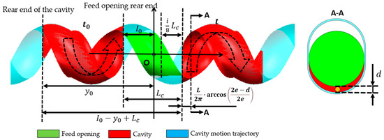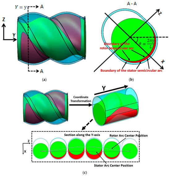 The position of the cavity moves forward along a fixed spiral path over time, and it needs to be dynamically tracked. The forward speed of the cavity is wL, and the rotational speed is 2πw. The cavity’s shape and structure are shown in the red area of Figure 10a, with an axial distribution range that is complex in three dimensions. The cross-section along the Y-axis of the cavity is depicted in Figure 10b, which reveals distinct structural features. The cavity’s cross-sectional area is located between the semi-circular arcs of the stator and rotor. The longitudinal direction of the stator slot is shown in Figure 10b, and the angle between it and the horizontal direction is denoted as θ. This angle is only related to the pitch and axial position of the cavity. The distance between the center of the stator’s semi-circular arc and the central point remains constant, whereas the center distance of the rotor’s semi-circular arc varies with time and axial position. Continuous tracking of the variation in the rotor’s arc center distance is required to accurately capture the cavity’s position and boundaries at any given time.