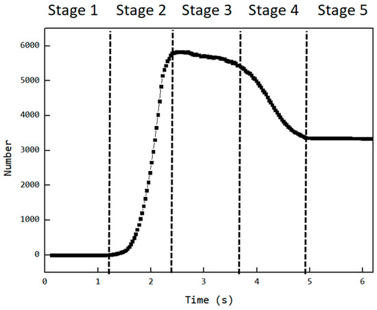 - Stage 2—Filling Phase: The cavity moves to the position where it is connected to the feed opening (as shown at t0 in Figure 6). Since the cavity has ample space at this stage, particles flow into the cavity rapidly along the cavity gap (FOZ2-Cavity2). This causes a sharp increase in the particle count, as seen in the Figure 11 curve;