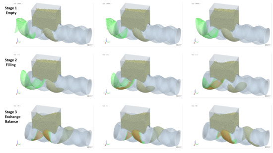 For the development and research of new equipment, relying solely on experimental data accumulation and experience would be very time-consuming and labor-intensive. Thanks to advancements in computer technology, the discrete element method (DEM) has become a powerful tool to simulate particle motions in recent years. The DEM was introduced by Cundall [10]; by considering the interactions between particles and between particles and walls, it can predict the flow behavior of solid particles with relative accuracy. As a result, it has been widely applied to powder transport systems, such as screw conveyer [11,12,13,14,15,16,17], feeder [18,19,20], drums [21,22,23,24], etc. [25,26,27], which helps analyze particle flow patterns, predict equipment performance, and further study on the underlying mechanisms, providing guidance for structural optimization. The Altair® EDEM™ 2023 (discrete element method (DEM) software) was selected, which is widely used to simulate particle motions using discrete elements [25,28,29,30], and it was used in this study to investigate the solid conveying process during the feeding of the ERE.
