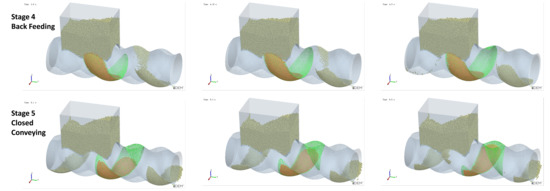 - Stage 5—Closed Conveying: In this final stage, the cavity becomes disconnected from the feed opening. Since the cavity is now closed, the particles inside the cavity remain in place. The number of particles retained in the cavity during this stage determines the feeding efficiency of the ERE.