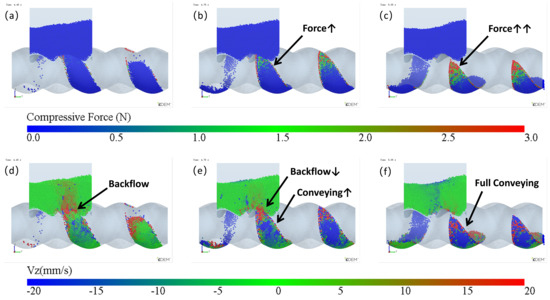 The evolution of particles in the cavity during the late stage of back feeding: (a–c) compressive force, (d–f) Vz.