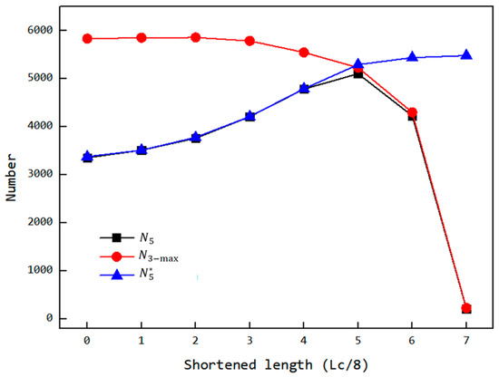 Variation in the number of particles inside the chambers (maximum value in the third stage , the fifth stage, and the fifth stage under the condition of full filling before backflow ) with the shortened length.