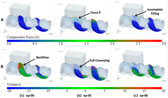 Particle parameters during the backflow stage: A—compressive force, B—Vz: (a) unoptimized feed opening, op-00; (b) appropriately feed opening length, op-05; (c) overly small feed opening, op-06.