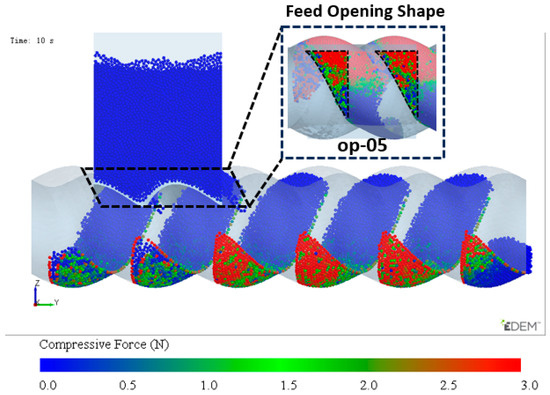 As shown in Figure 18, under normal simulation conditions, the number of particles inside the cavity (maximum value in the third stage and the fifth stage ), as well as the number of particles inside the cavity when it is initially filled before the back feeding stage (fifth stage ), varies with the reduction in the feed opening length. From the trend of the curves, it can be observed that if the effect of the reduced feed opening on the filling stage is ignored, and the cavity is kept filled before the back feeding stage, increases monotonically with the reduction in the opening length. This is because the back feeding stop time is advanced. Under normal simulation conditions, the trend of the number of follows an initial increase and then a decrease with the reduction in the feed opening length. Between op-00 and op-05, increases as the feed opening length decreases, with the growth curve overlapping the curve of . Between op-05 and op-07, however, decreases with the reduction in the feed opening length, and the curve deviates from the curve of while still overlapping with the curve of . This behavior occurs because when the filling amount decreases, the number of particles in the cavity during the back feeding phase is insufficient to fully fill the VCZ (as shown in Figure 19c). The compression of the VCZ does not generate enough pressure to move the particles, and the number of particles in the cavity remains unchanged, similar to .