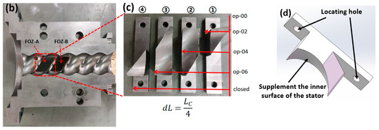 To verify the feasibility and mechanism of the optimization plan, verification equipment (the main structural parameters of the stator and rotor are shown in Table 1) was designed as shown in Figure 22. The equipment includes feed ports (FOZ-A and FOZ-B) located at the corresponding positions (similar to the feed port position in Figure 8), along with adjustment accessories (used to supplement the inner surface of the stator and shorten the feed opening) (①–④) for altering the feed port opening. The width of the accessories is 1/4Lc. When no accessories are installed, it corresponds to the simulation of op-00. As the accessories (①–④) are added sequentially, they correspond to op-02, op-04, op-06, and the closed state. The exploded view of the equipment is provided in Supplementary Material Video S3. The material used in the experiment is ultra-high-molecular weight polyethylene UPE4040.