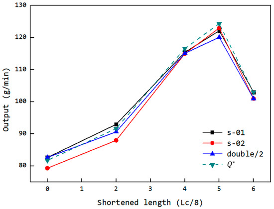 Variation of the output with the feed opening shortening amount and the simulated equivalent output of the ERE adjustable feed opening experimental machine (s-01: single feeding for FOZ-A; s-02: single feeding for FOZ-B; double: simultaneous feeding).