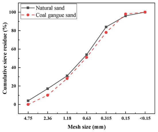 The cement (Conch Co., Ltd., Xuancheng, China) used was P.O. 42.5 ordinary Portland cement. The natural sand is provided by Jiuqi Building Materials Company, Zhucheng, China. The coal gangue was sourced from the Laogongyingzi Coal Mine of Pingzhuang Coal Industry (Group) Co., Ltd., Chifeng, China. The chemical and mineral compositions of natural sand and coal gangue sand are shown in Table 1 and Figure 1, respectively. The main minerals in coal gangue sand were inert minerals such as quartz, montmorillonite, and mullite, indicating that coal gangue sand possesses a certain level of stability. Figure 2 presents the particle size distribution of natural sand and coal gangue sand, and the fineness modulus of coal gangue sand and natural sand is 2.65 and 2.82, respectively. According to the Chinese standard GB/T 14684-2022, both sands are classified as medium sand, with natural sand being coarser than coal gangue sand. The bulk density of coal gangue sand is 1350 kg/m3, with a water absorption rate of 6.5%, while the bulk density of natural river sand is 1500 kg/m3, with a water absorption rate of 1.1%. Figure 3 shows the BET test results of coal gangue sand, which has a specific surface area of 11.23 m2/g. This result is consistent with previous studies indicating the porous nature of coal gangue sand. The accelerator used was a J85-type accelerator (Xinda New Materials Co., Ltd. Huaibei, China) (main chemical components are Al2O3 and SiO2), a polycarboxylate superplasticizer was used as the water reducer (Shanxi Feike New Materials Technology Co., Ltd. Yuncheng, China), and the water used is tap water.