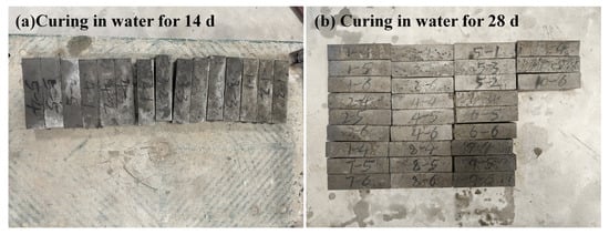 Figure 5 shows the surface images of coal gangue sand shotcrete after being soaked in water for different curing periods. It can be observed that shotcrete with varying coal gangue sand content did not exhibit corner chipping or cracking after 14 and 28 days of water immersion. Even when fine aggregates were entirely replaced with coal gangue sand, no corner chipping or cracking occurred. Shotcrete is primarily used for reinforcing surrounding rock in underground spaces and often interacts with groundwater fractures. Whether the specimen deforms after water immersion determines whether coal gangue can be used in shotcrete. After water immersion, the crystal expansion forces of these components change significantly, and the original crystal structure is destroyed, which macroscopically manifests as expansion deformation and disintegration of coal gangue. This study found that the surface of shotcrete prepared with coal gangue sand as fine aggregate did not exhibit bending or cracking, indicating the preliminary feasibility of using coal gangue sand in shotcrete preparation.