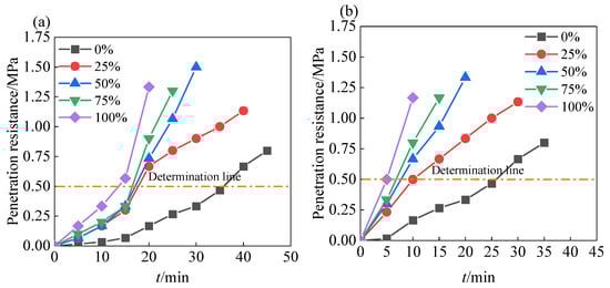 Effect of different coal gangue substitution rates on the setting time of shotcrete mortar under different water–cement ratios: (a) water–cement ratio of 0.55; (b) water–cement ratio 0.4.