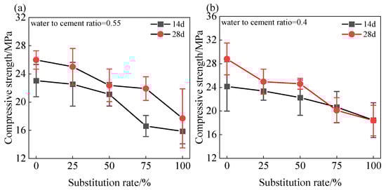 Effect of different coal gangue substitution rates on the compressive strength of shotcrete mortar under different water cement ratios: (a) water–cement ratio of 0.55; (b) water–cement ratio 0.4.