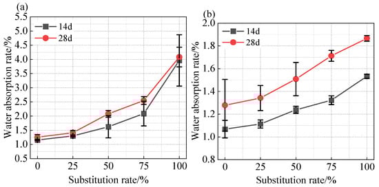 Effect of different coal gangue substitution rates on the water absorption of shotcrete mortar under different water cement ratios: (a) water–cement ratio of 0.55; (b) water–cement ratio 0.4.