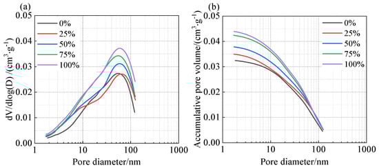 N2 adsorption–desorption isotherm testing is a commonly used microscopic characterization method to analyze the pore size distribution and pore structure characteristics of materials through adsorption isotherms. This method not only reveals the microscopic characteristics of materials but also avoids damage to the sample structure caused by the low strength of coal gangue. Figure 9 shows the effect of different coal gangue sand content on the pore structure of shotcrete under a water–cement ratio of 0.4.