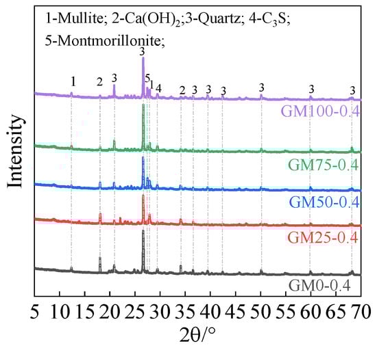 Figure 10 shows the XRD patterns of mortar after 28 days of curing under a water–cement ratio of 0.4. It can be observed that the main crystalline phases in the mortar include calcium hydroxide, quartz, tricalcium silicate, and montmorillonite [27]. Among these, tricalcium silicate is the primary mineral component in cement, producing calcium hydroxide and C-S-H gel during the hydration process [23], while quartz and montmorillonite are inherent mineral components in coal gangue sand and natural sand.