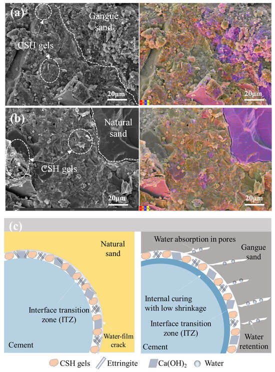 Figure 12 exhibits the micro-interface of coal gangue shotcrete mortar under a water–cement ratio of 0.4. As shown in Figure 12a, when the shotcrete mortar contains only natural sand, a distinct crack appears at the junction of the interface transition zone between the natural sand and the hardened paste. The formation of such cracks is mainly due to the non-water-absorbing property of natural sand, which causes water to accumulate around its particles, creating a water film effect. The presence of the water film not only weakens the bonding performance of the interface transition zone but also leads to cracks during the later hardening process due to cement shrinkage.
