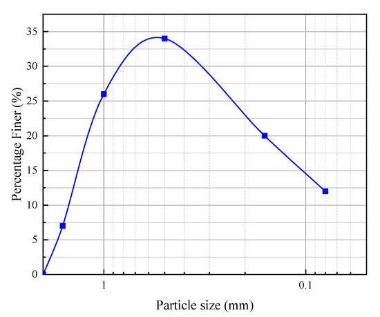 In this experiment, soil samples were prepared using the drying and sieving method. After the grout was prepared, samples were molded using a standard mold with dimensions of 70.7 mm × 70.7 mm × 70.7 mm. To analyze the effects of different materials and dosages on the grout system’s performance parameters, the experiment selected clay, sand, lake mud, and additives (sodium silicate and HY-4). The clay was sourced from the typical red clay in the Yuelu Mountain area (Figure 2). The specific gravity of the lake mud is 2.671, with a compression coefficient of 0.893 MPa−1, a liquid limit of 41.18%, and a plastic limit of 22.08%, as determined by laboratory tests. The aggregate used was ISO standard sand produced by Xiamen Aiso Standard Sand Co., Ltd. (Xiamen, China), with the particle grading curve shown in Figure 3.