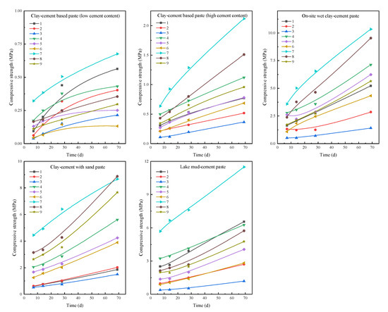 The overall trend of compressive strength for the grout solidified bodies is as follows: (e) > (c) > (d) > (b) > (a). The lake mud-cement grout-solidified body exhibited the highest average compressive strength within the testing range, with the clay-cement with sand grout showing similar strength, while the on-site wet clay-cement grout had slightly lower compressive strength compared to the first two. The compressive strength of clay-cement-based grout (low cement content) was significantly lower than that of the other systems, but its preparation process is simple and does not require large amounts of solvents or liquid treatment, making it suitable for simple grouting projects.