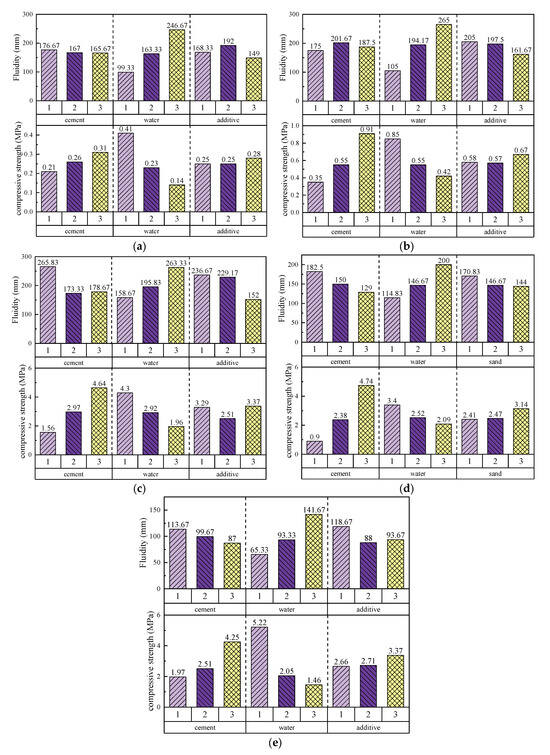 To evaluate the results of the orthogonal experiment, analysis of variance (ANOVA) was performed on the 28-day compressive strength data of all the solidified grouts. The range values (R-values) for each factor level were calculated through range analysis (Table 3) to quantify the impact of each factor on flowability and compressive strength. The results show that water content is the dominant factor affecting the flowability of all grout systems, although its importance varies with the system composition. The following is a detailed analysis of each grout system: