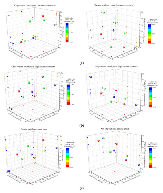 Three-dimensional scatter plots were used to analyze the effects of various factors on the grout properties (Figure 7), where the x and y axes represent water content and cement content, and the third variable is represented by a color gradient.