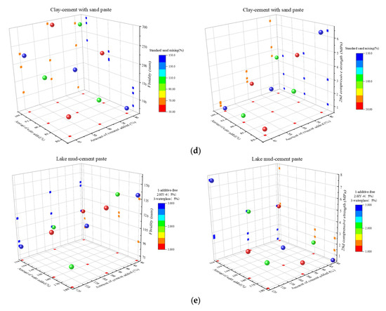 Three-dimensional scatter plot of paste for each system ((a): clay-cement-based paste (low cement content); (b): clay-cement-based paste (high cement content); (c): on-site wet clay-cement paste; (d): clay-cement with sand paste; (e): lake mud-cement paste).